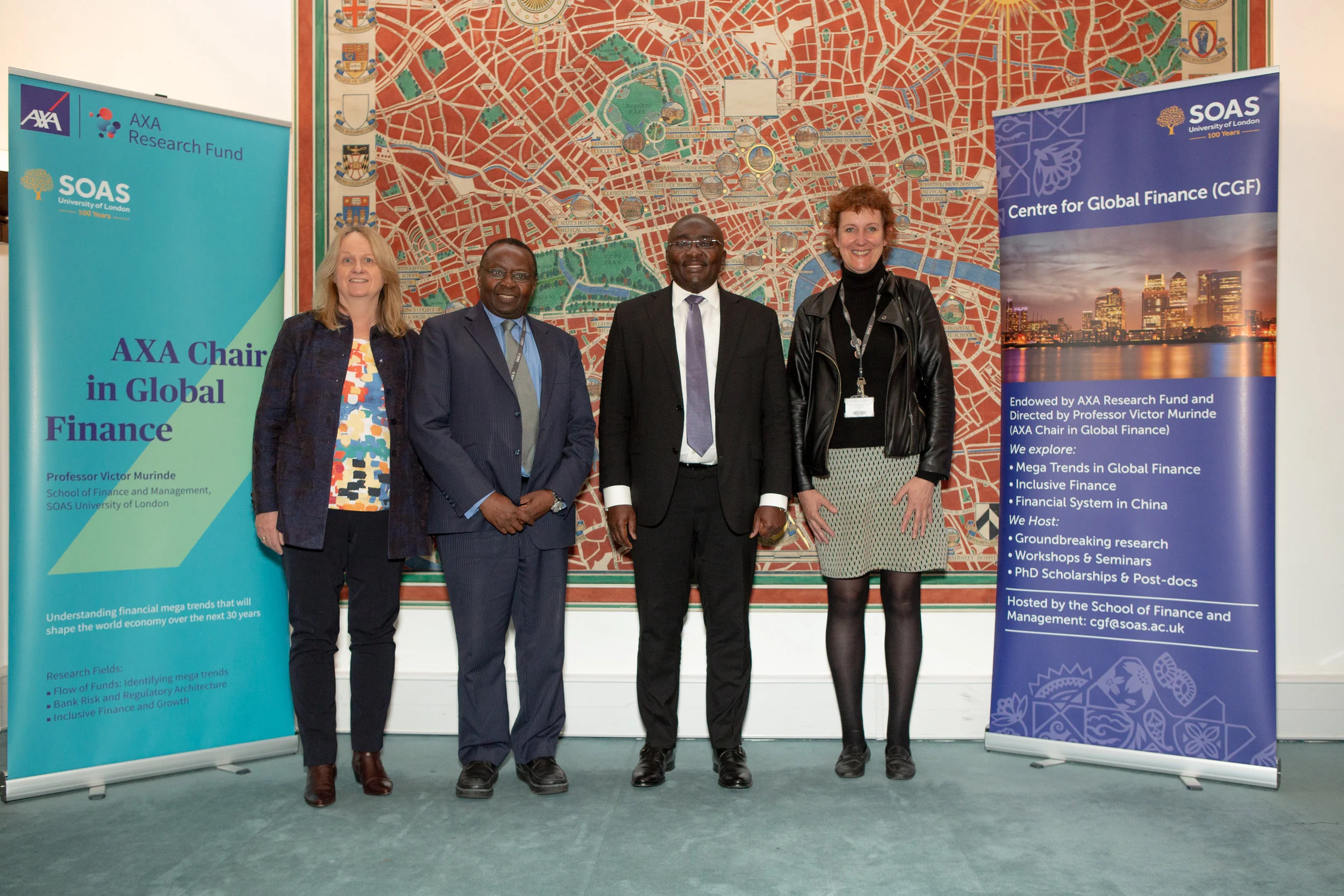 (left to right): Prof Christine Oughton, Prof Victor Murinde, H.E. Dr Mahamudu Bawumia, Prof Andrea Cornwall